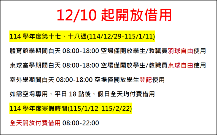 您現在的位置: 首頁 / 其他訊息 / 114/12/10起開放借用寒假場地