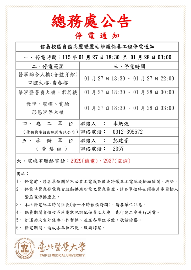 因學校高壓電保養,體育館1/27 (二) 17:30後暫不開放,包含游泳池以及場地租借,造成不便敬請見諒。